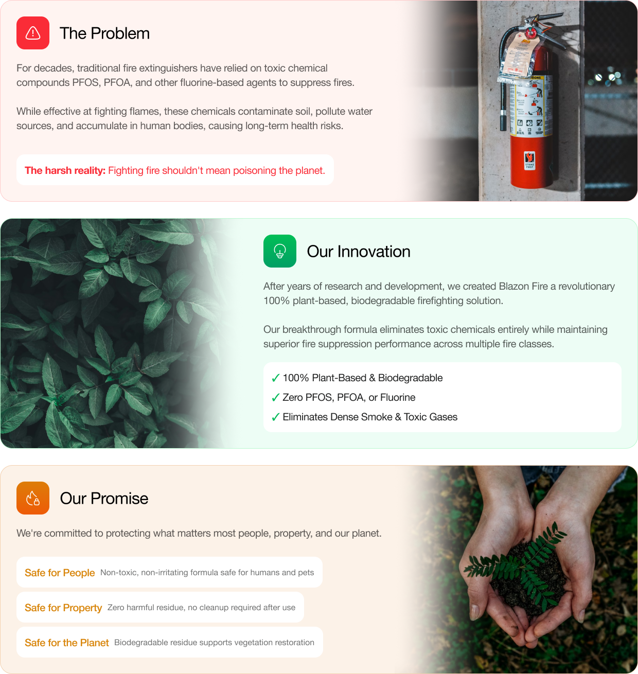 At Blazon, we set out to solve a global problem: traditional firefighting extinguishers that stop flames but leave behind toxic chemicals, polluting soil, water, and even our bodies.